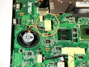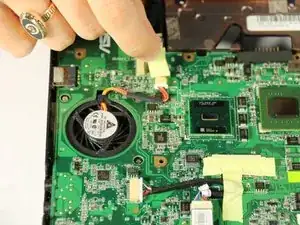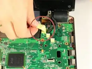 Чтобы отсоединить разъём экрана с верхней левой стороны материнской платы, нужно отогнуть ленту, удерживающую провода вентилятора.