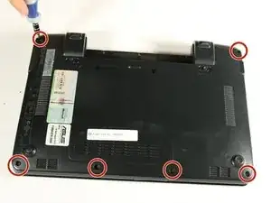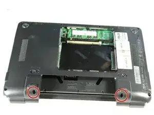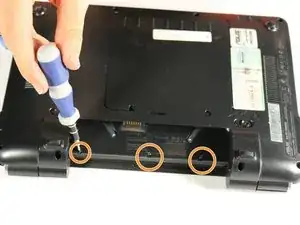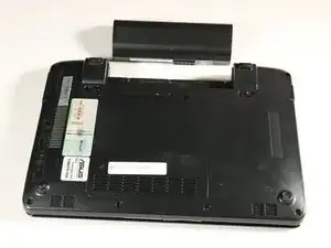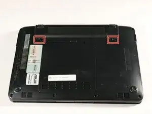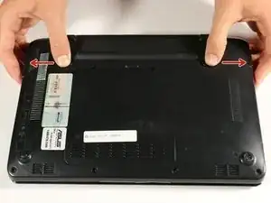 Для этого шага разместите нетбук с закрытым экраном и положите его на плоскость задней стороной вверх. Отсек для аккумулятора должен быть обращён к Вам.