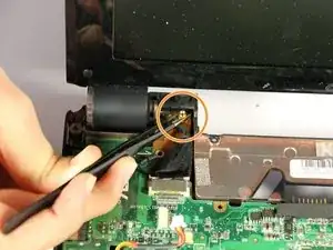 Материнская плата останется подключённой к экрану чёрными и белыми проводами в верхнем левом углу. Для полного отсоединения извлеките карту беспроводной сети с материнской платы.