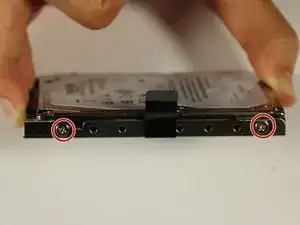 Чтобы снять металлический корпус жесткого диска, используйте отвертку с головкой T6 (звездочка), чтобы открутить шесть винтов 4 мм, отмеченных красными кружками на изображении.
