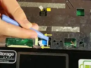 Отсоедините провод в верхнем левом углу корпуса клавиатуры от места подключения с помощью пластиковой лопатки. Поместите пластиковой лопаткой на один конец белой пластиковой детали. Потяните за край детали, чтобы извлечь её из разъёма.