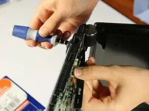 Проведите пластиковой лопаткой вдоль стороны нетбука, одновременно поднимая вверх и удерживая её зажатой между двумя чёрными деталями. Это ослабит соединение.