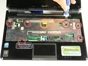Уже сняв клавиатуру, найдите шесть винтов 7 мм на серебристой пластине в корпусе клавиатуры.