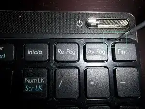 Возьмите маленькую плоскую отвёртку и по очереди отведите 5 защёлок, удерживающих клавиатуру. Начинайте с правого конца и приподнимайте клавиатуру, нажимая защёлки в направлении экрана.