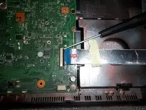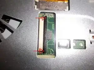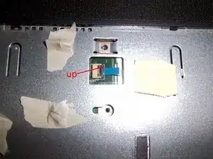 Вы найдёте разъём тачпада, скрытый изолирующей лентой. Поднимите чёрную часть разъёма, чтобы извлечь ленточный кабель.
