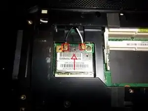 Уберите один винт Ph00, чтобы вынуть плату Wi‑Fi, затем аккуратно отключите оба антенных кабеля, учитывая черный и белый подключения.