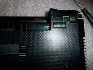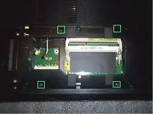 Начните с извлечения батареи и двух винтов Ph0, указанных здесь, затем сдвиньте крышку, чтобы получить доступ к жесткому диску, модулям ОЗУ и плате Wi‑Fi.