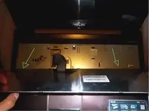 Вы также найдёте ленточный кабель кнопки питания под лентой. Поднятие чёрной части разъёма позволит также удалить этот кабель.