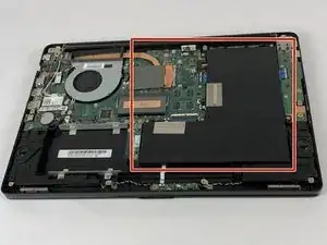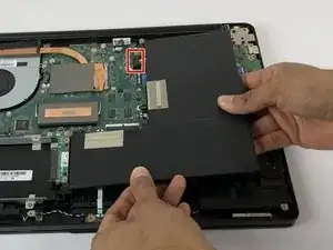 К материнской плате подходит несколько тонких проводов (восьми штук), подключающих аккумулятор. Поднимайте аккумулятор осторожно и строго вертикально, чтобы разъединить эти провода и избежать повреждений.