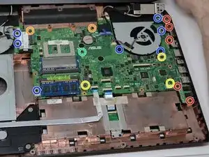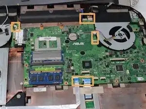 Отсоедините все разъёмы, показанные в оранжевых квадратах. Для мелких разъёмов может потребоваться пластиковый инструмент для вскрытия.
