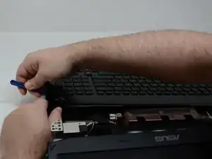 Подденьте клавиатуру по верхней стороне, как показано, чтобы снять её с корпуса.