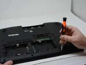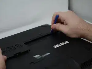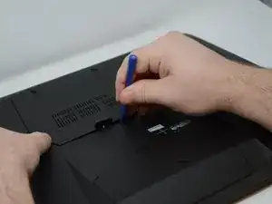 Переверните компьютер вверх дном и поднимите резиновую заглушку на задней панели, чтобы получить доступ к удерживаемому винту Phillips #2.