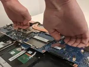 Возьмите материнскую плату за область вокруг вентиляторов и поднимите вверх.