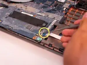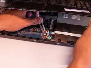 Отсоедините три шлейфа, соединяющие материнскую плату и клавиатуру. Для этого поднимите белую защёлку и вытяните шлейф. Для каждого шлейфа предусмотрена одна защёлка.