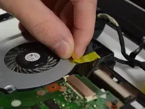 Отклейте чёрную и жёлтую ленты, прикрепляющие вентилятор к корпусу.