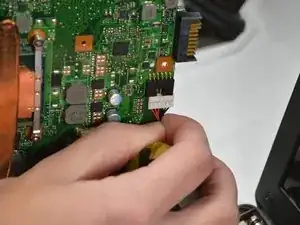 Осторожно и медленно приподнимите материнскую плату от корпуса и отсоедините красно-чёрный кабель под материнской платой в верхнем левом углу рядом с вентилятором.