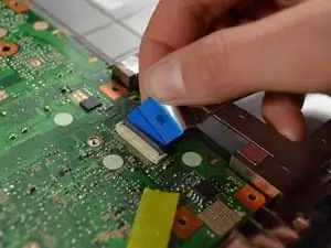 Отсоедините синий кабель в правом нижнем углу, приподняв язычок и вытащив кабель.