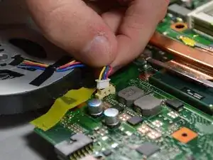 Отсоедините красный, синий, чёрный и жёлтый кабели, соединяющие вентилятор и материнскую плату, пальцами.