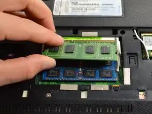 Извлеките модуль оперативной памяти, приподняв его пальцами и сдвинув на себя.