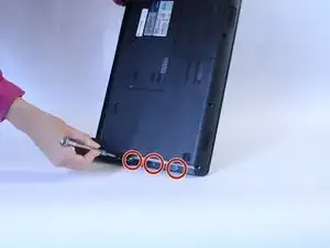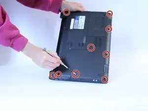 После снятия клавиатуры выкрутите девять винтов длиной 6 мм на задней стороне ноутбука.