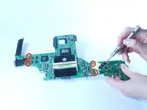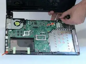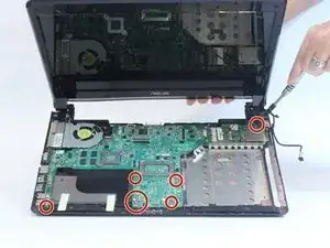 Снимите семь винтов 3 мм, удерживающих материнскую плату и платы портов в каркасе ноутбука, а также две жгутовые проводки, указанные красными стрелками.