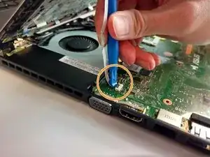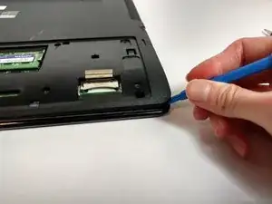 Используя пластиковый инструмент для вскрытия, приоткройте заднюю крышку ноутбука.