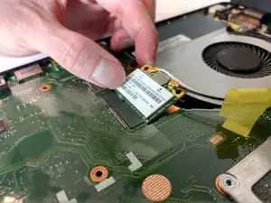 Отключите модуль беспроводной сети (WLAN) от материнской платы, потянув разъём вверх.