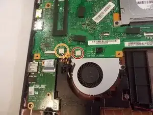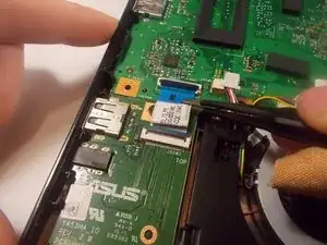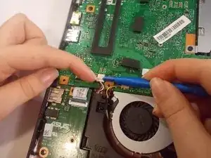 Отсоедините групповой кабель, который соединяет вентилятор с материнской платой, с помощью пластиковой монтажной лопатки iFixit.