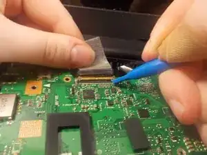 Отогните защёлку на ленточном кабеле и вытяните ленту, чтобы снять клавиатуру с ноутбука.