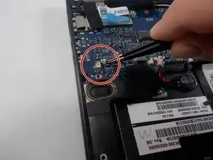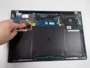 Отключите собранный разъём аккумулятора от материнской платы, аккуратно потянув кабель вверх.