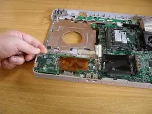 Сначала снимите левую часть материнской платы. Возможно, потребуется слегка выгнуть корпус, чтобы освободить разъёмы FireWire и USB от корпуса