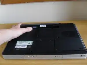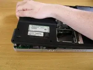 Переверните ноутбук и возьмитесь за нижнюю крышку в месте, где был DVD-привод