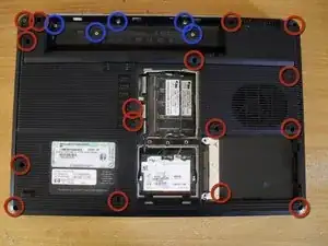 Снимите 16 винтов с нижней крышки (тёмные винты, 6 мм)