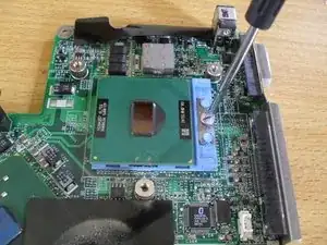 Используйте плоскую отвертку, чтобы повернуть фиксатор процессора и извлечь процессор