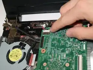 Отключите шлейф клавиатуры от материнской платы, подняв чёрную защёлку и вынув шлейф из разъёма.