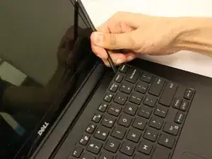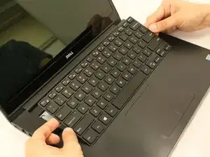 С помощью пластикового открывающего инструмента аккуратно подденьте каждую щель, чтобы ослабить клавиатуру.