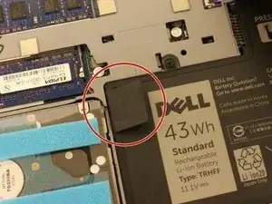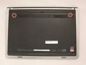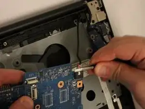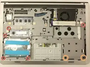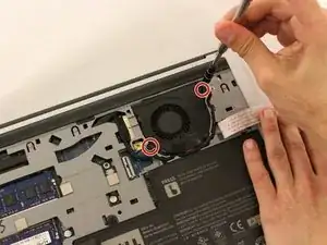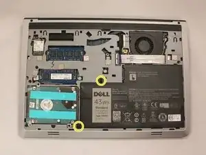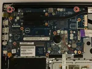 Найдите и открутите верхние два черных винта (5.70 мм), которые крепят материнскую плату к основанию ноутбука.