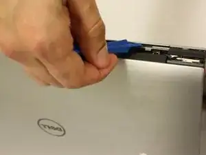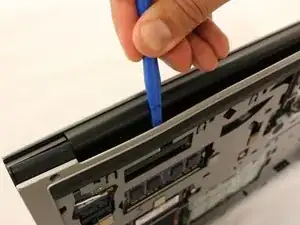 С помощью синей лопатки аккуратно подденьте серую пластиковую накладку. Обратите внимание на отверстия по верхней стороне между шарнирами.