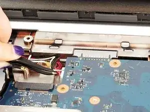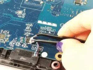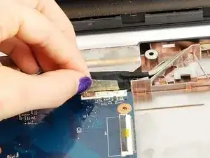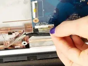 Отсоедините кабели в верхнем левом углу ноутбука с помощью плоских пинцетов.