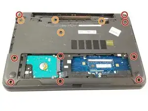 Удалите девять винтов 8,65 мм, крепящих заднюю панель к ноутбуку, используя отвертку PH0.
