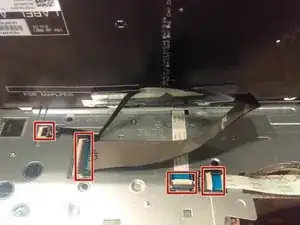 Отключите все четыре показанных кабеля, подняв фиксаторы и вытянув кабели прямо из разъёмов. После этого отложите клавиатуру в сторону.