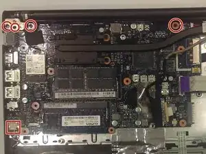 В центре материнской платы расположена беспроводная карта. С помощью отвёртки Phillips J0 выкрутите отмеченный винт, затем отключите два провода.