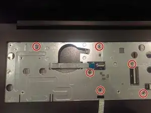 При помощи металлической лопатки нажмите на пять указанных фиксаторов, затем проведите лопаткой вдоль левой и правой сторон клавиатуры. Клавиатуру можно снять, потянув её вверх и в сторону экрана. Не отводите её слишком далеко, так как к ней по-прежнему подключены кабели.