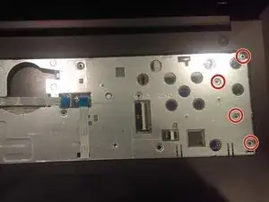 С помощью отвёртки Phillips J0 выкрутите четыре отмеченных винта и отсоедините отмеченный кабель.