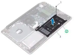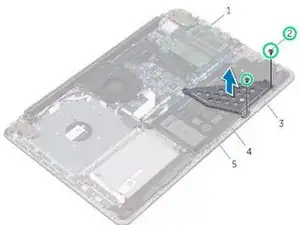 Удалите винты, которые фиксируют скобу аккумулятора к системной плате, подлокотнику и клавиатурному блоку.