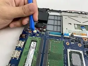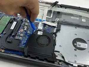 Аккуратно отключите кабель вентилятора от материнской платы с помощью синего пластикового инструмента.