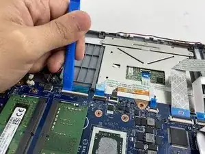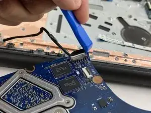 Отключите два кабеля, подключённых к материнской плате, с помощью синего пластикового инструмента.