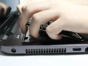 Переверните ноутбук так, чтобы аккумулятор был обращён к Вам.