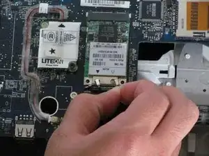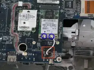 Когда материнская плата будет свободна, переверните её в сторону экрана ноутбука и аккуратно отсоедините чёрный и белый провода от беспроводного модуля.