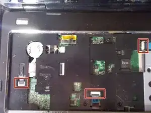 Поднимите чёрные фиксаторы разъёмов коричневых кабелей в трёх отмеченных местах.